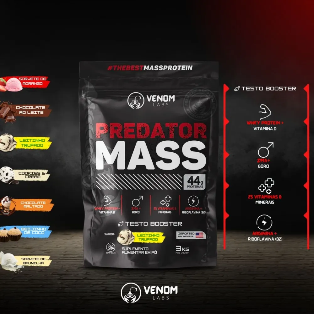 Hipercalórico PREDATOR MASS 3kg TESTO BOOSTER (44g proteínas por porção) Venom Labs